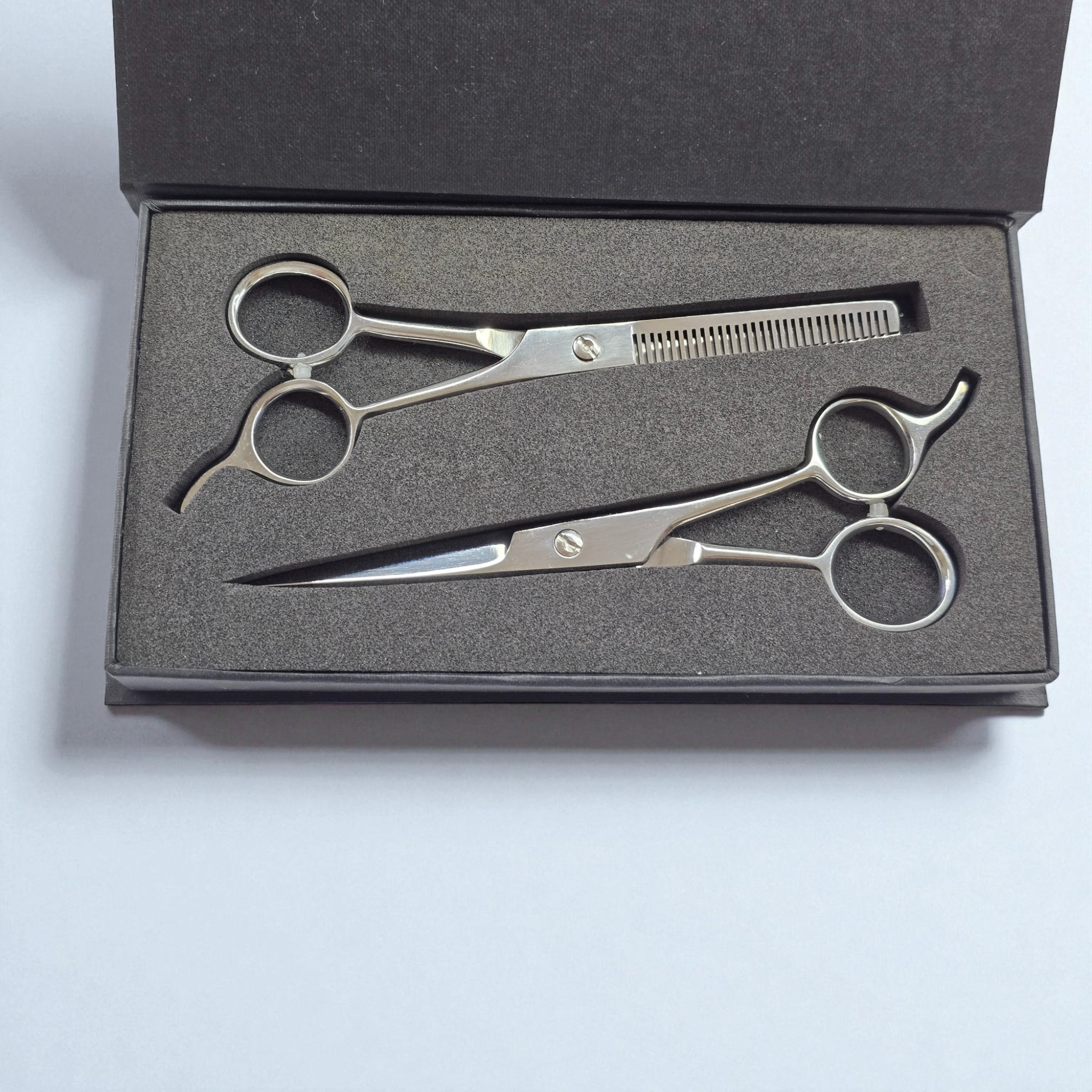 - Set Contents: 1 straight-edge cutting shear + 1 thinning shear (texturizing shear)