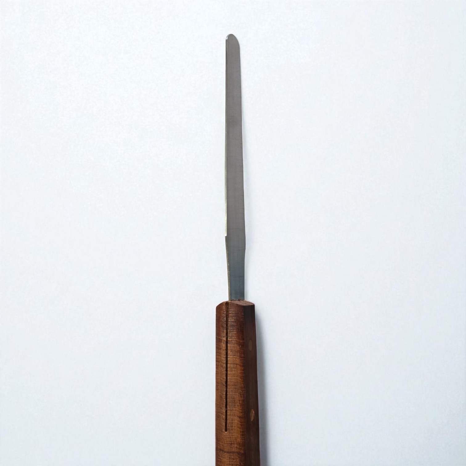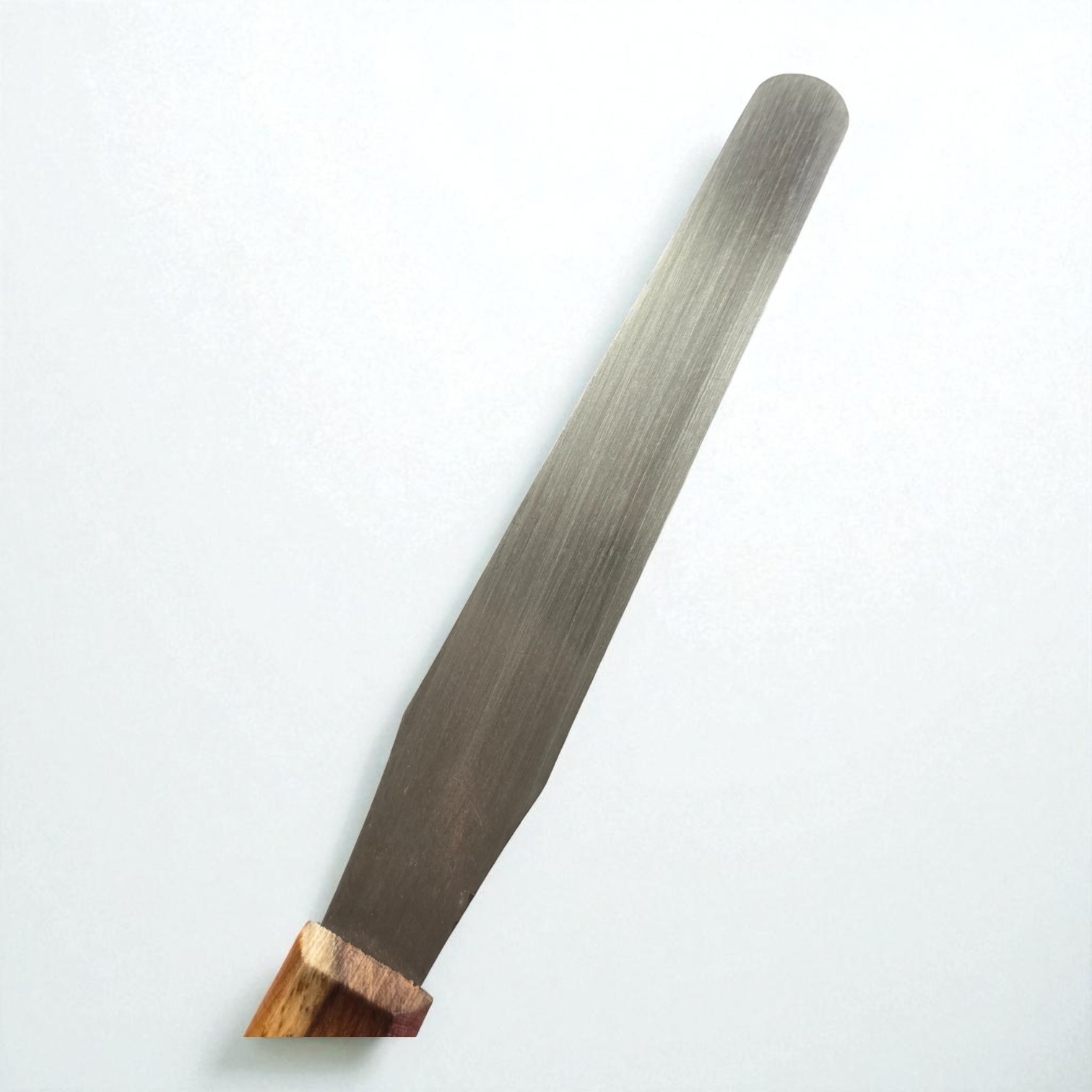 • Blade: Wide, flat, and flexible (1-1.5 cm wide), with a smooth, slightly curved edge